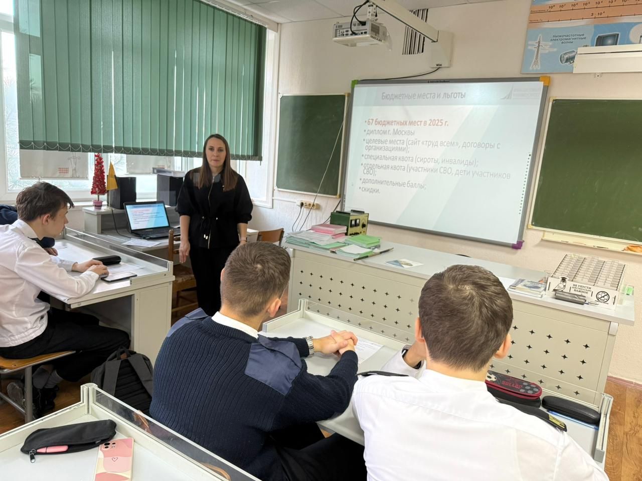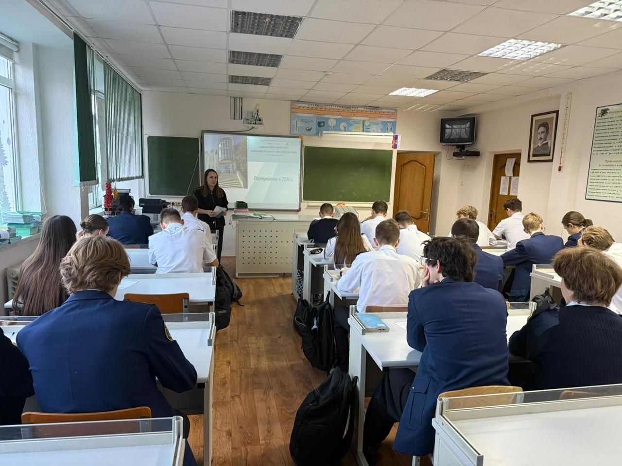 11 декабря 2025 года к.э.н., доцентом кафедры "Экономика, финансы и менеджмент" Граммовой Е.А. проведено профориентационное мероприятие для 11 "А" класса лицея "Морской технический" в рамках курса "Россия - мои горизонты". Преподаватель рассказала будущим абитуриентам о правилах поступления в вуз, о направлениях, о пороговых значениях вступительных экзаменов. Также Граммова Е.А. ответила на вопросы будущих выпускников о преимуществах профессий экономической направленности.
