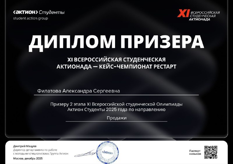 Филатова Александра, студентка 1 курса направления "Экономика", призер 2 этапа XI Всероссийской студенческой Олимпиады "Актион Студенты 2025 года" по направлениям "Менеджмент" и "Продажи".