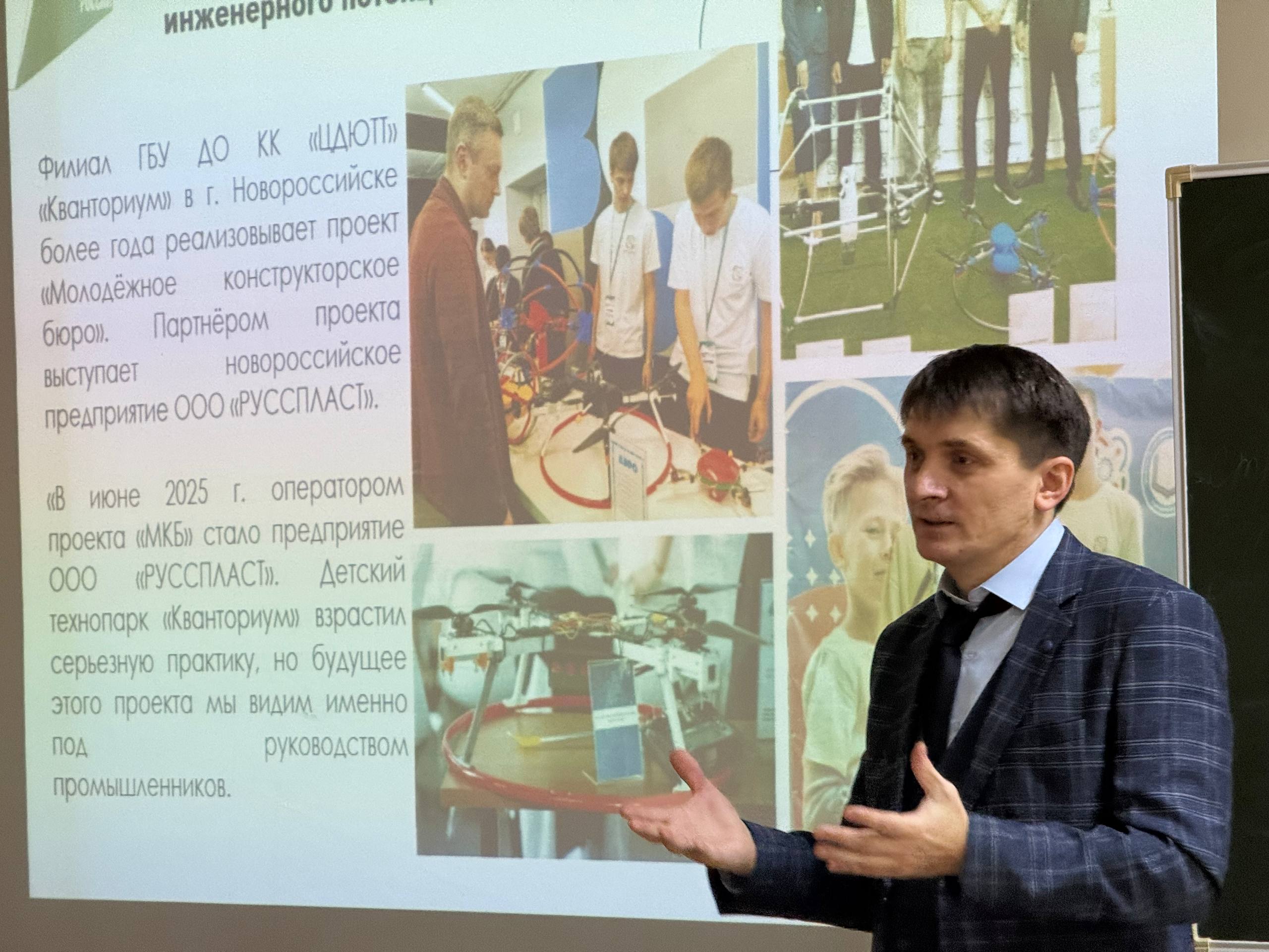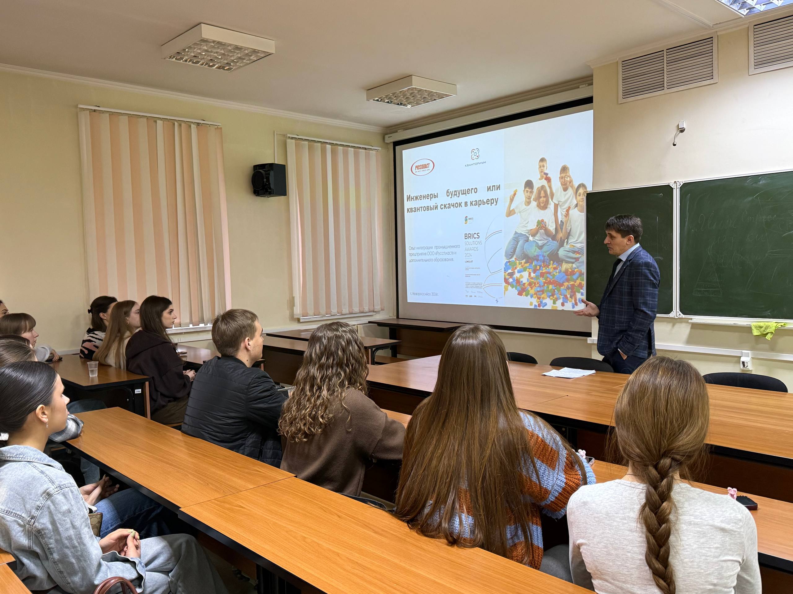 В своем выступлении Максим Георгиевич сделал акцент на синергии образования и реального сектора экономики. Он поделился со студентами научными достижениями и разработками воспитанников «Кванториума», продемонстрировав, как инновационные идеи воплощаются в жизнь уже в школьном возрасте.
