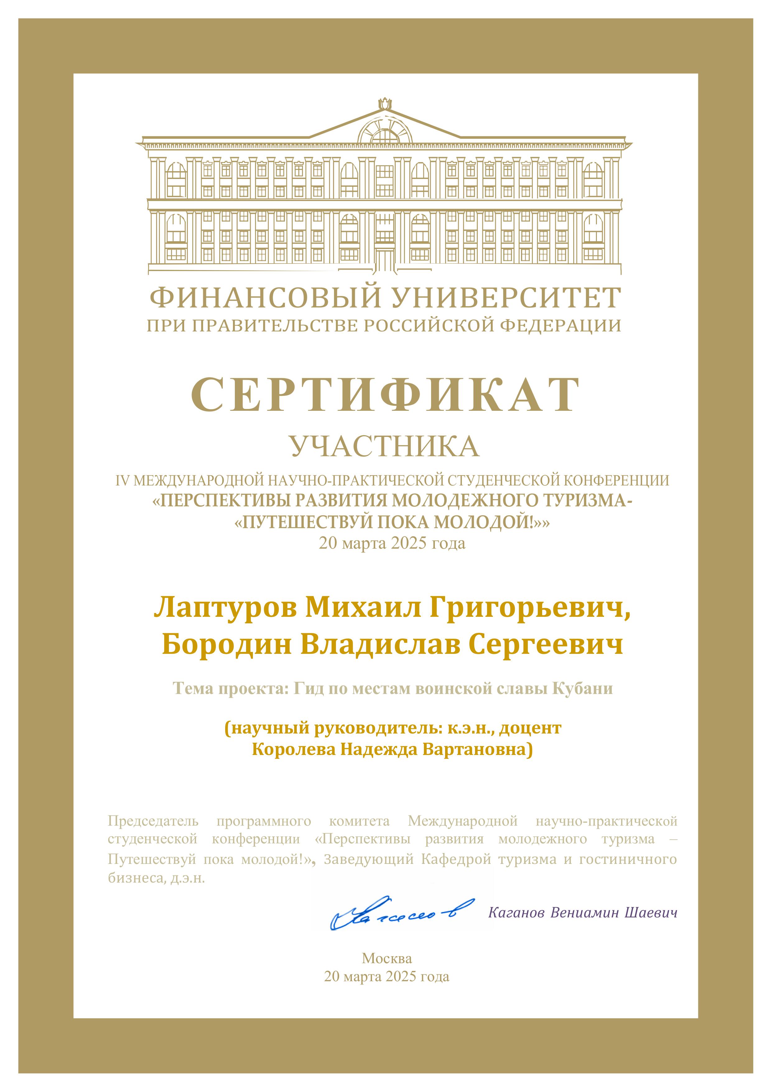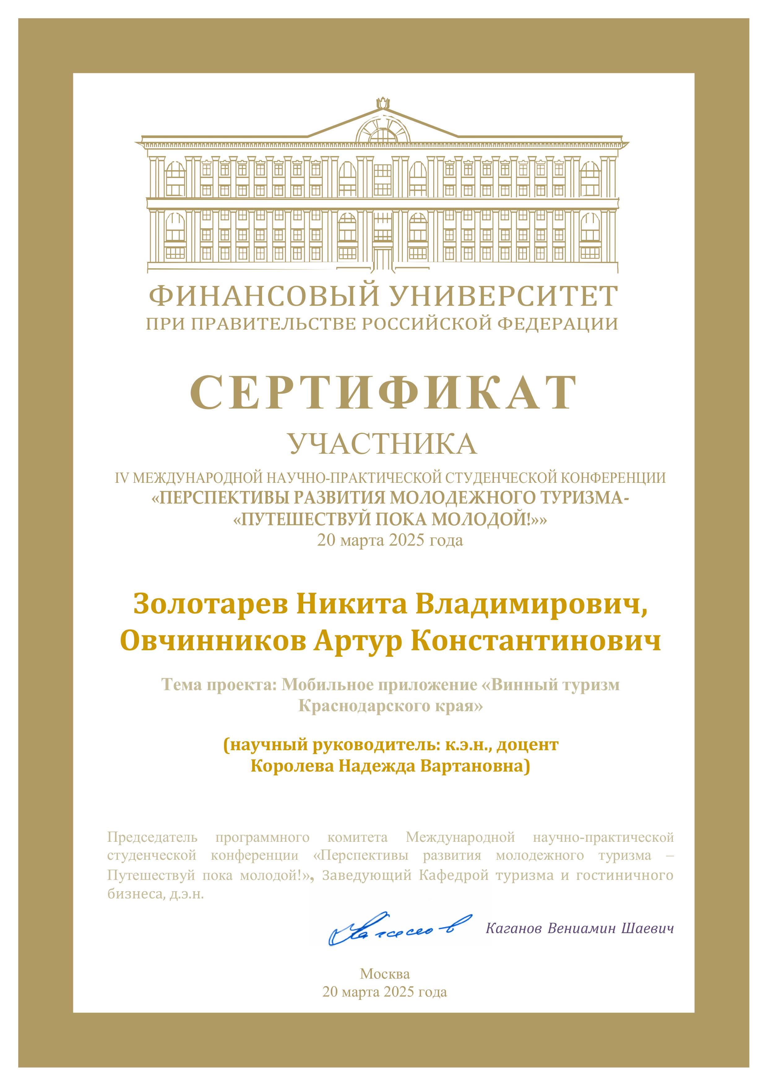 20 марта 2025 года студенты Золотарев Никита Владимирович, Овчинников Артур Константинович, Лаптуров Михаил Григорьевич, Бородин Владислав Сергеевич приняли участие в конкурсе в рамках IV МЕЖДУНАРОДНОЙ НАУЧНО-ПРАКТИЧЕСКОЙ СТУДЕНЧЕСКОЙ КОНФЕРЕНЦИИ «ПЕРСПЕКТИВЫ РАЗВИТИЯ МОЛОДЕЖНОГО ТУРИЗМА-«ПУТЕШЕСТВУЙ ПОКА МОЛОДОЙ!» 20 марта 2025 года