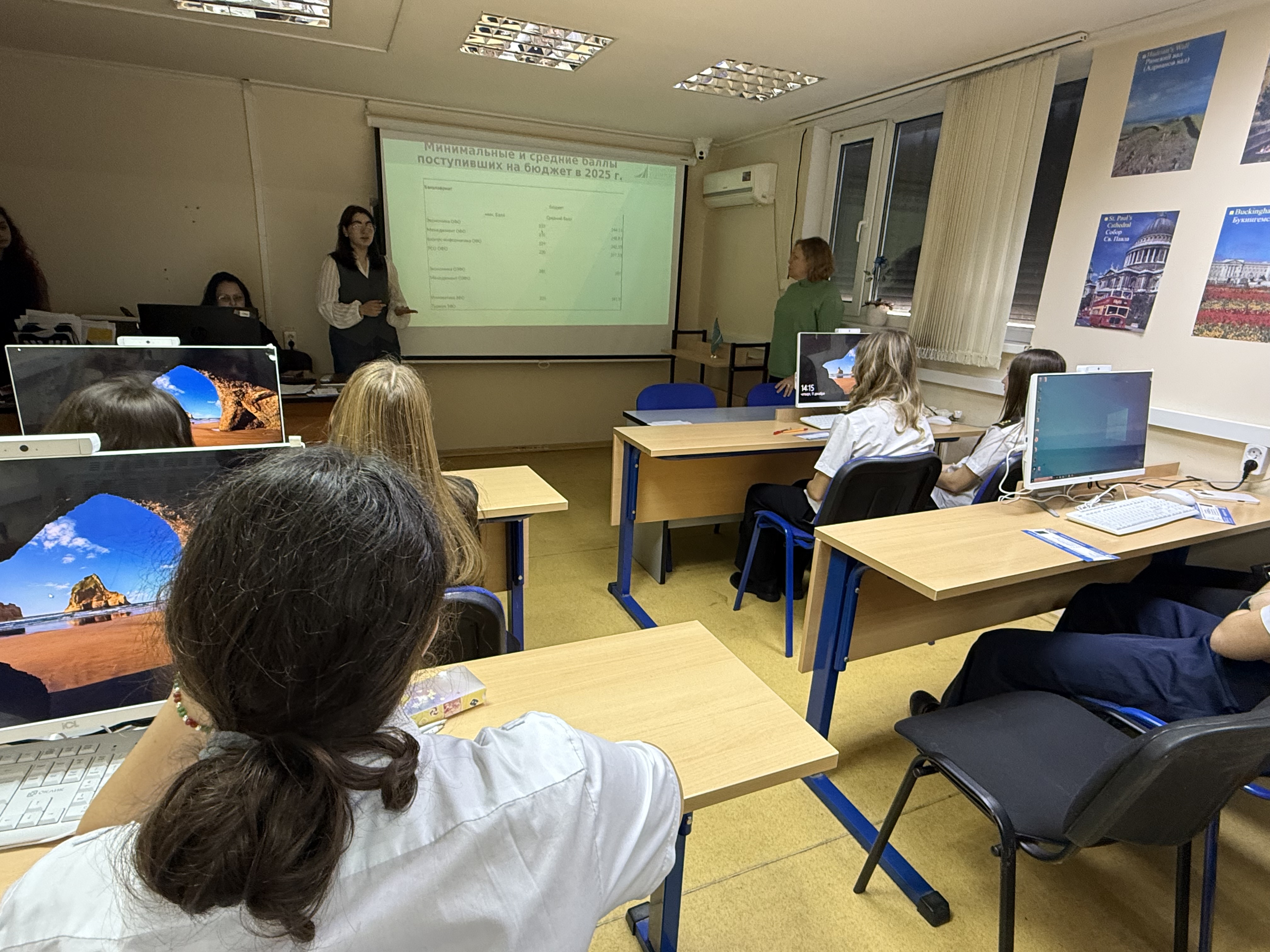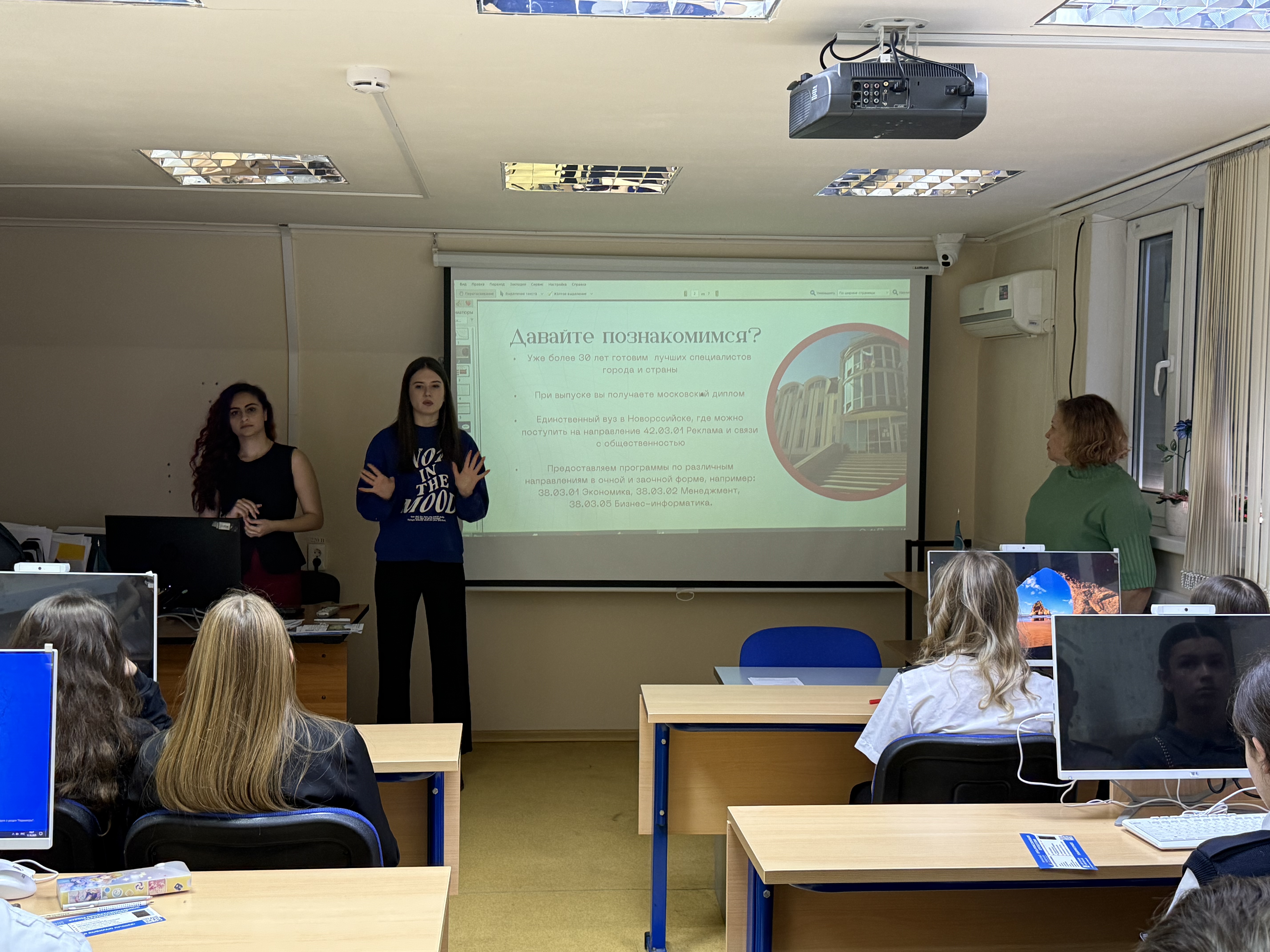 В рамках встречи с учениками 9 класса старшим преподавателем Ишик И.Н. и студенткой 2 курса направления подготовки Экономика Балаян Сюзаной была предоставлена подробная информация о преимуществах Финансового университета, его роли в подготовке кадров, о правилах приема, особенностях подачи документов и стратегии выбора образовательной программы, были даны ответы на все интересующиеся вопросы.