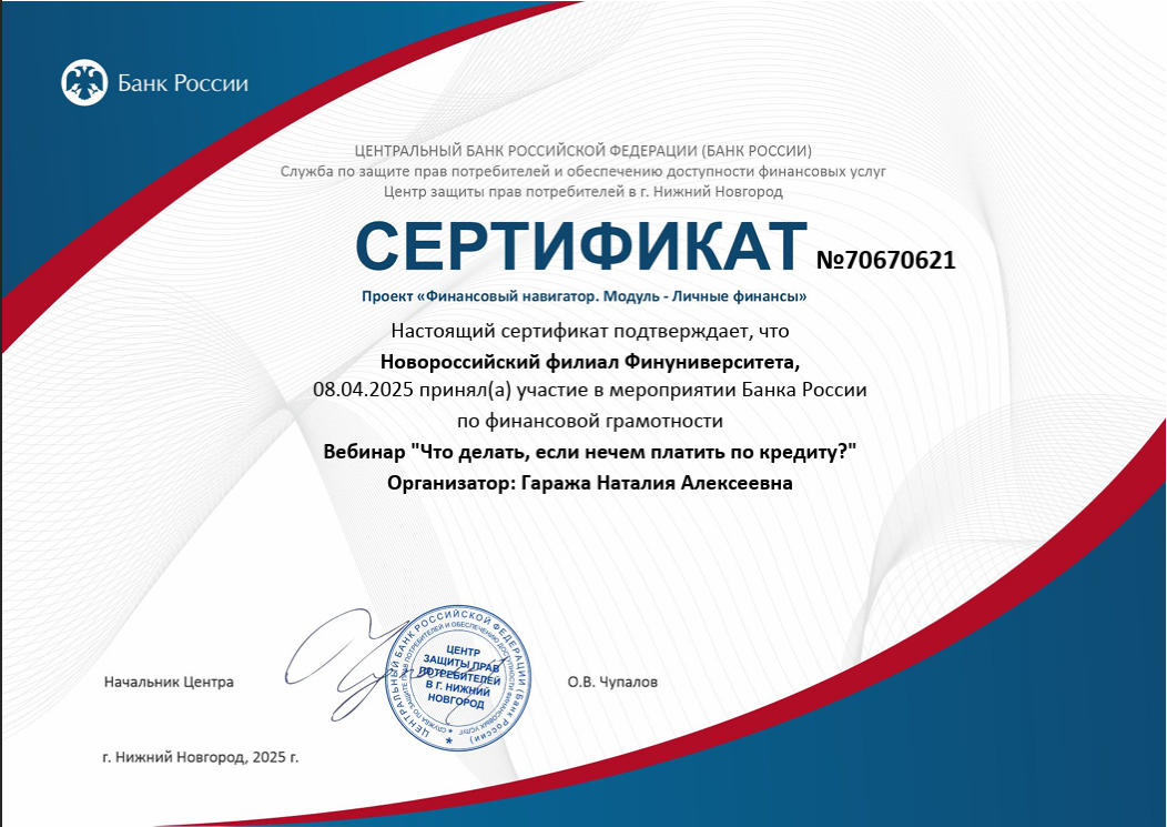 В апреле 2025 года в рамках Весенней сессии онлайн проектов Банка России по финансовой грамотности студенты Финансового университета при Правительстве РФ (г.Новороссийск) приняли участие в вебинарах проекта "Грамотный инвестор".