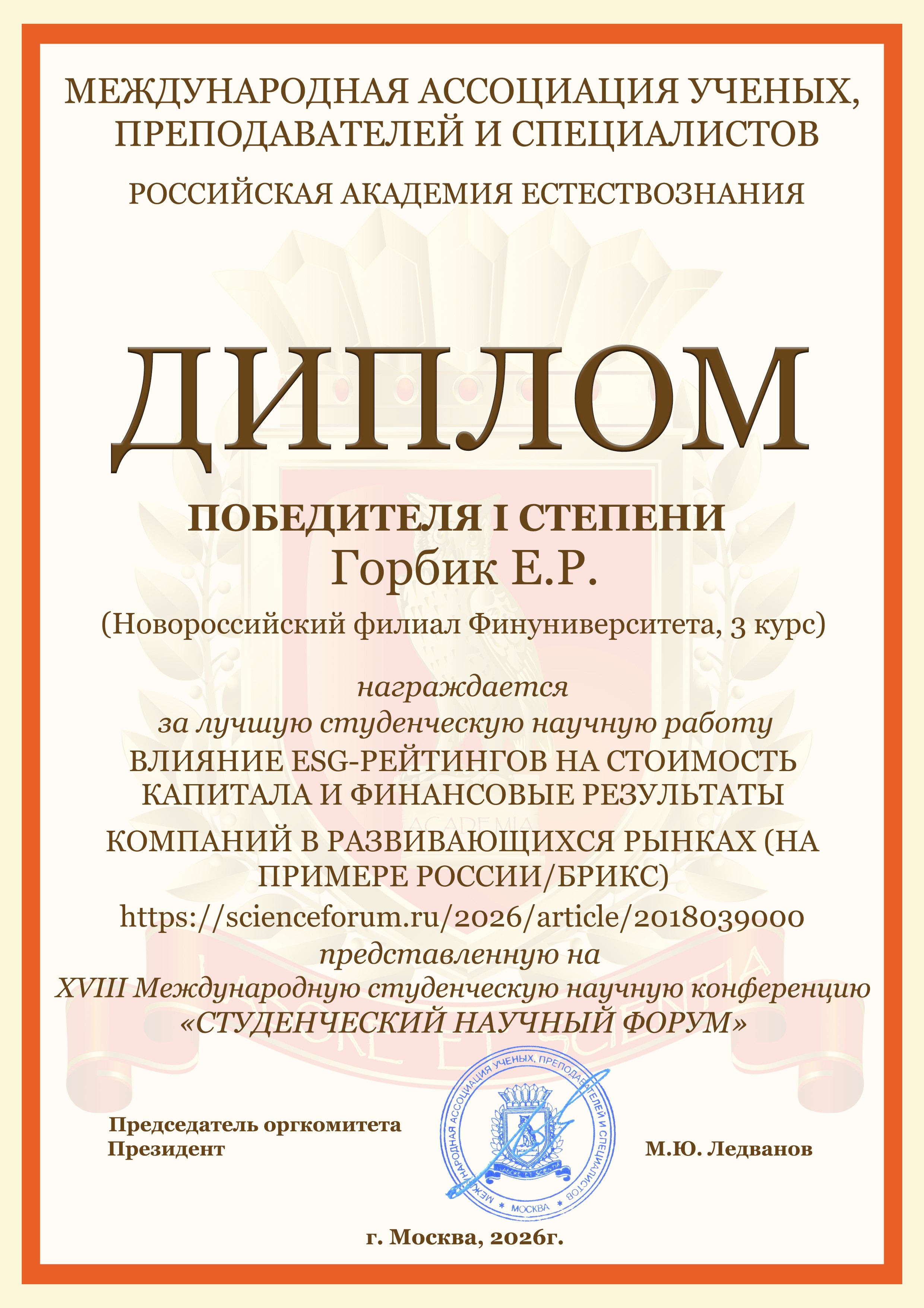 - Горбик Е.Р. Влияние ESG-рейтингов на стоимость капитала и финансовые результаты компаний в развивающихся рынках (на примере России/БРИКС) https://scienceforum.ru/2026/article/2018039000