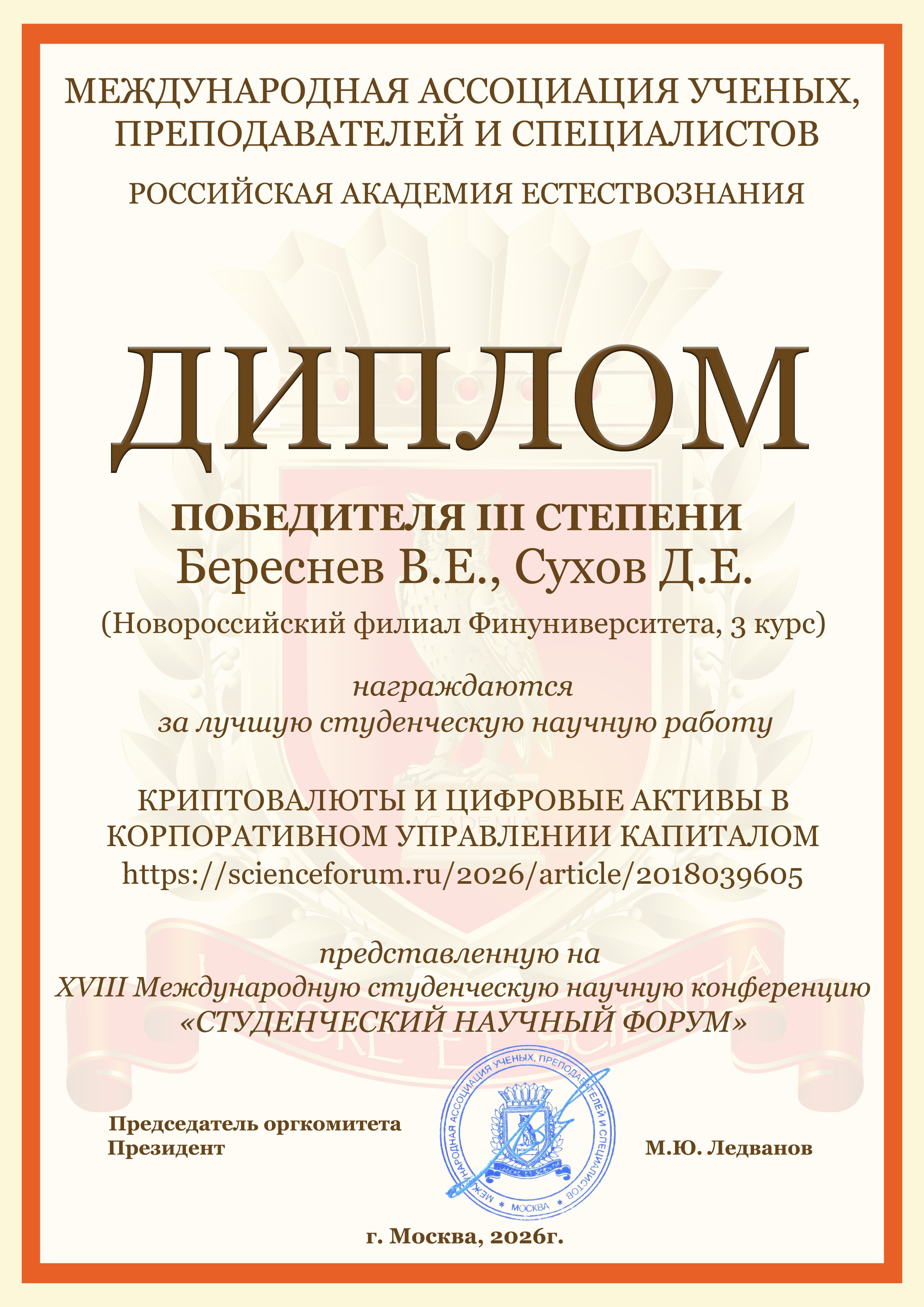- Береснев В.Е., Сухов Д.Е. Криптовалюты и цифровые активы в корпоративном управлении капиталом https://scienceforum.ru/2026/article/2018039605