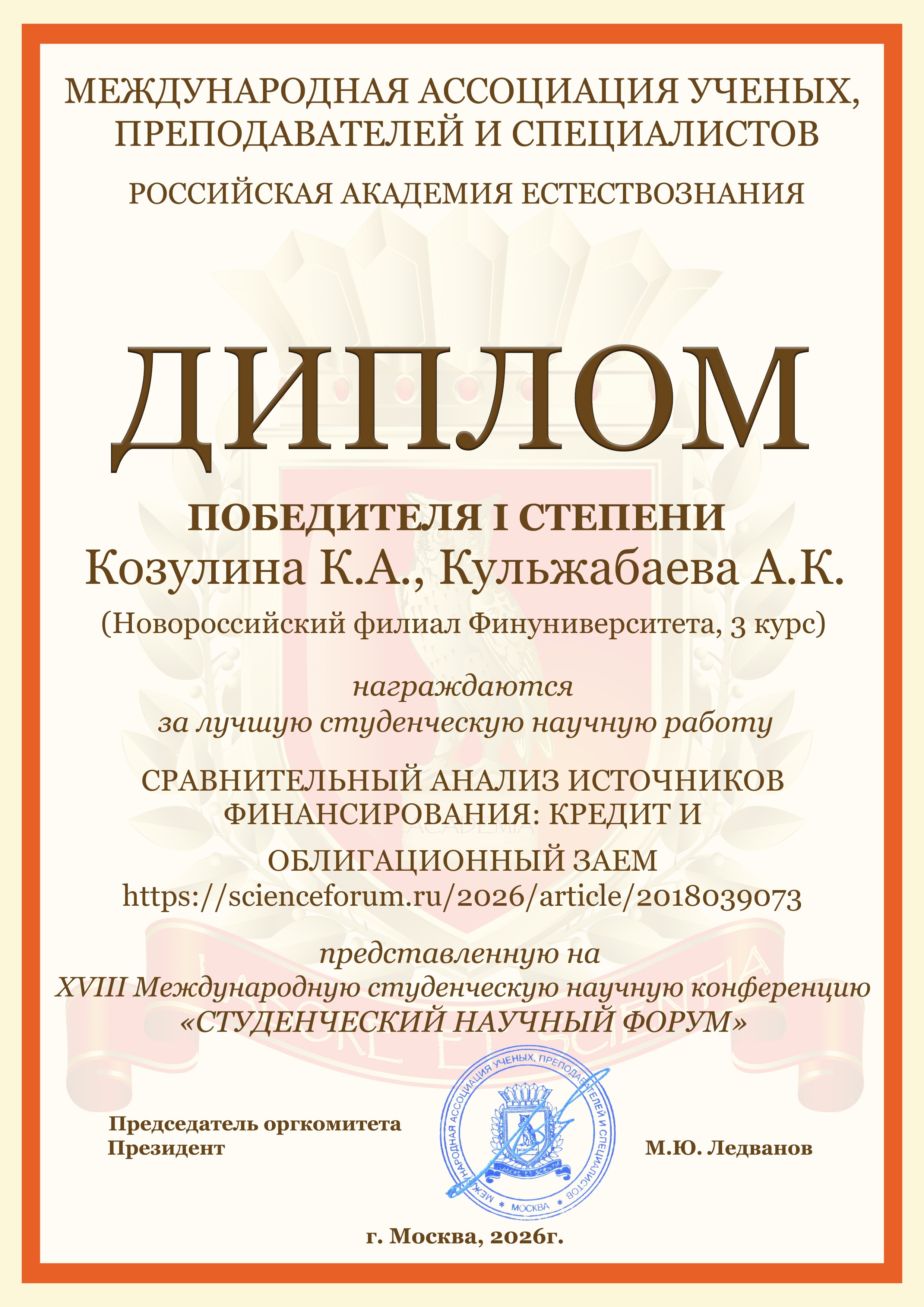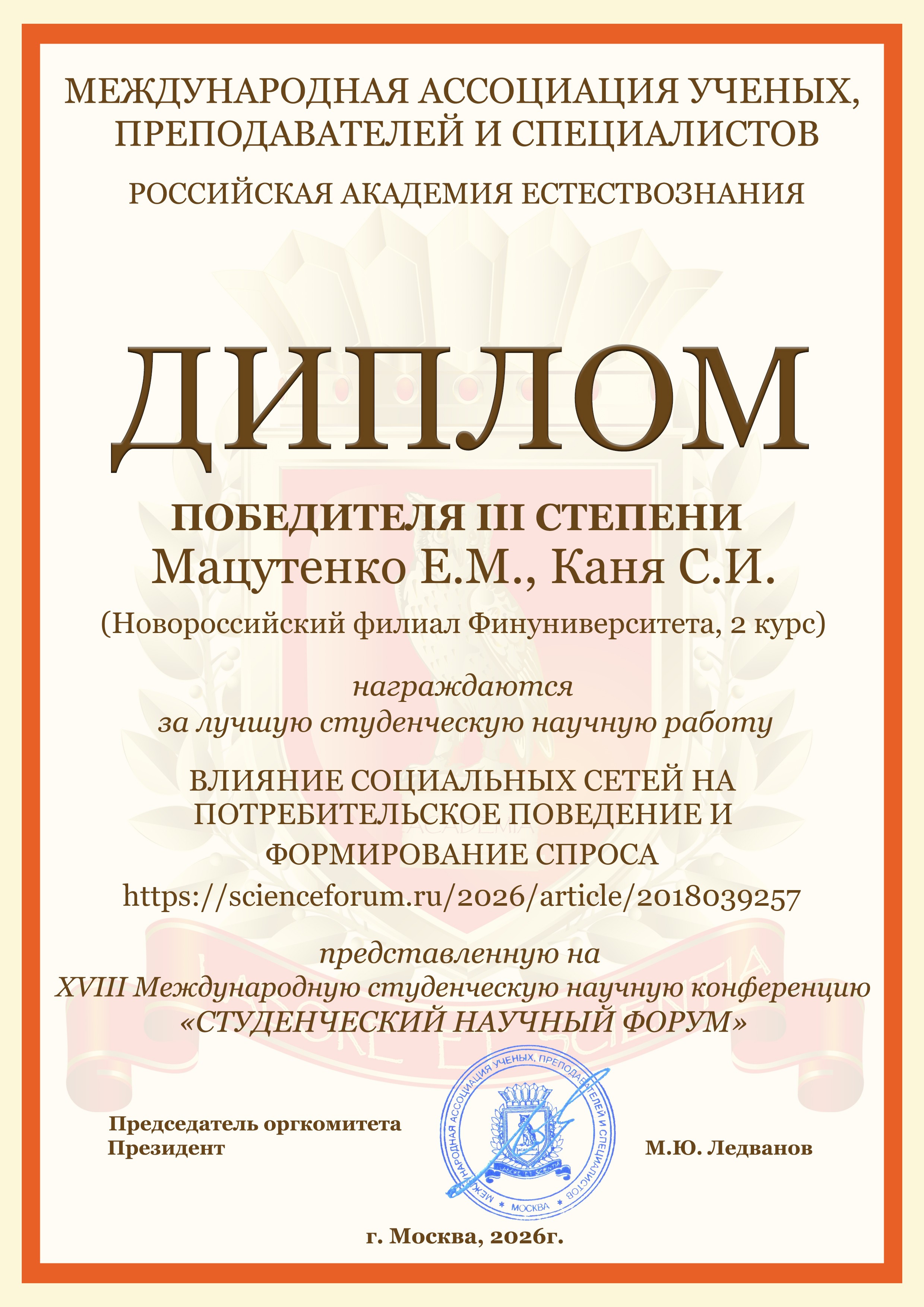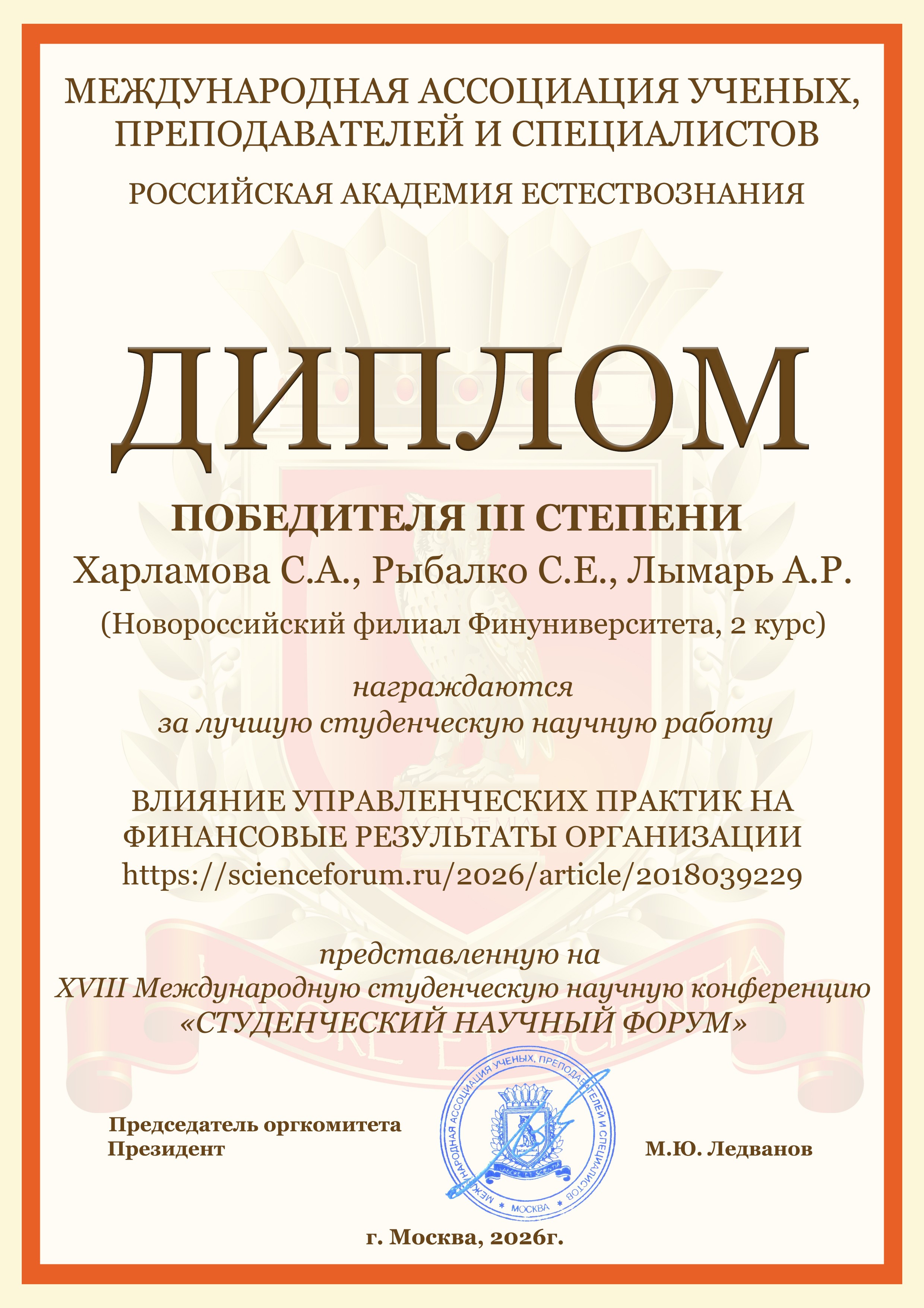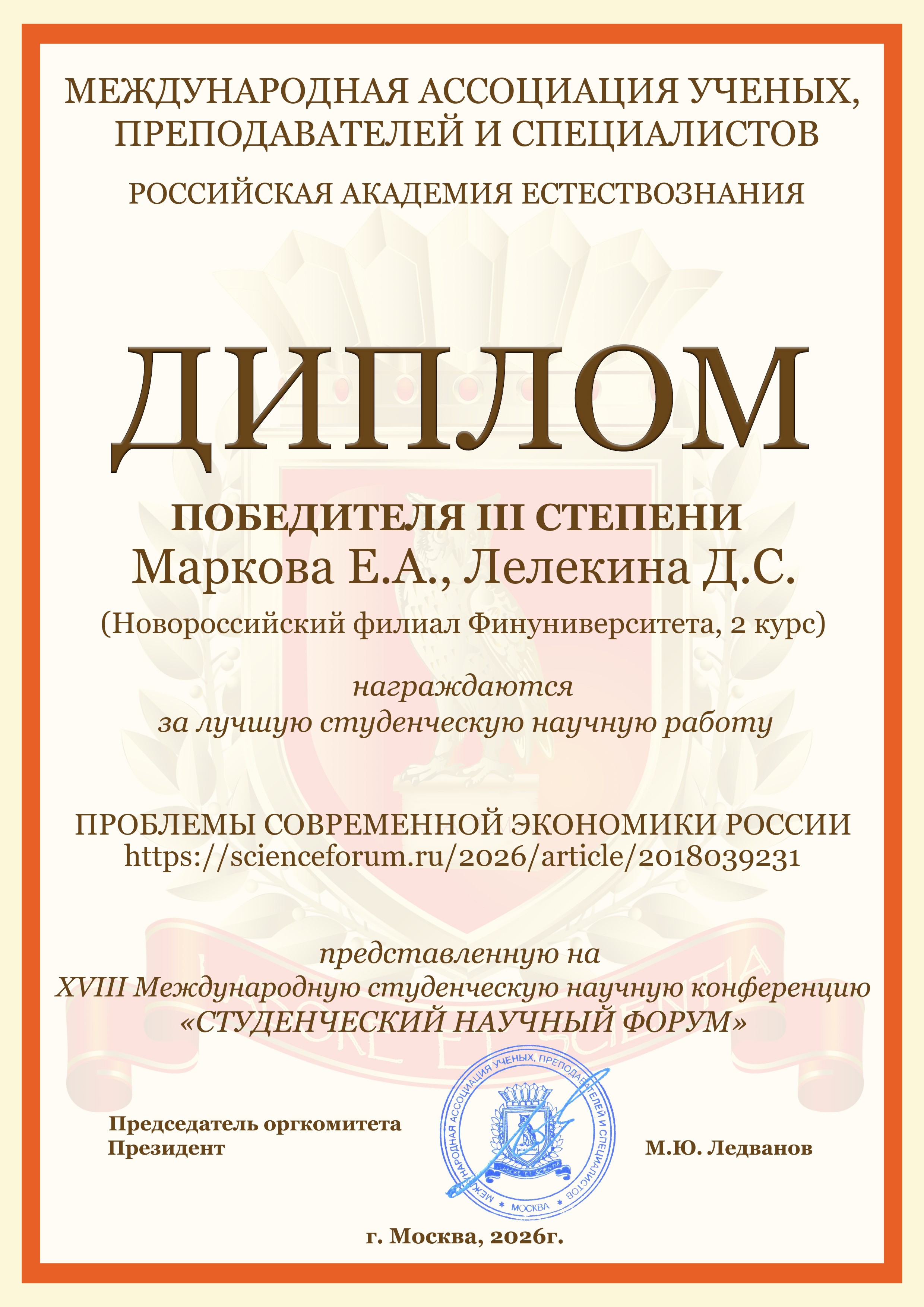 Студенты бакалавриата и магистратуры Новороссийского филиала Финуниверситета очной и очно-заочной форм обучения направлений подготовки "Экономика" и "Менеджент" приняли активное участие в Международной студенческой научной конференции «Студенческий научный форум 2026», организатором которой является Российская Академия Естествознания (г. Москва).