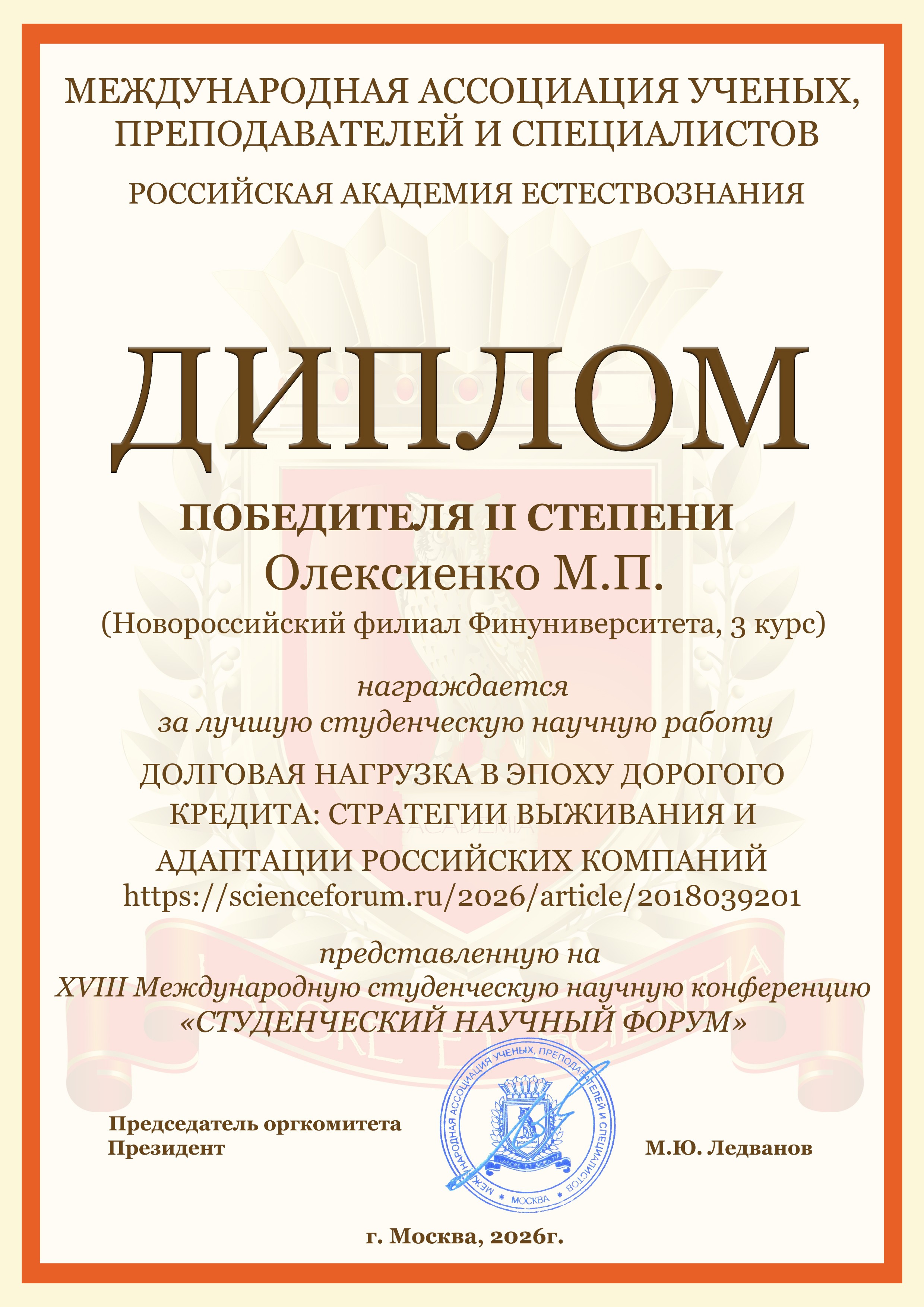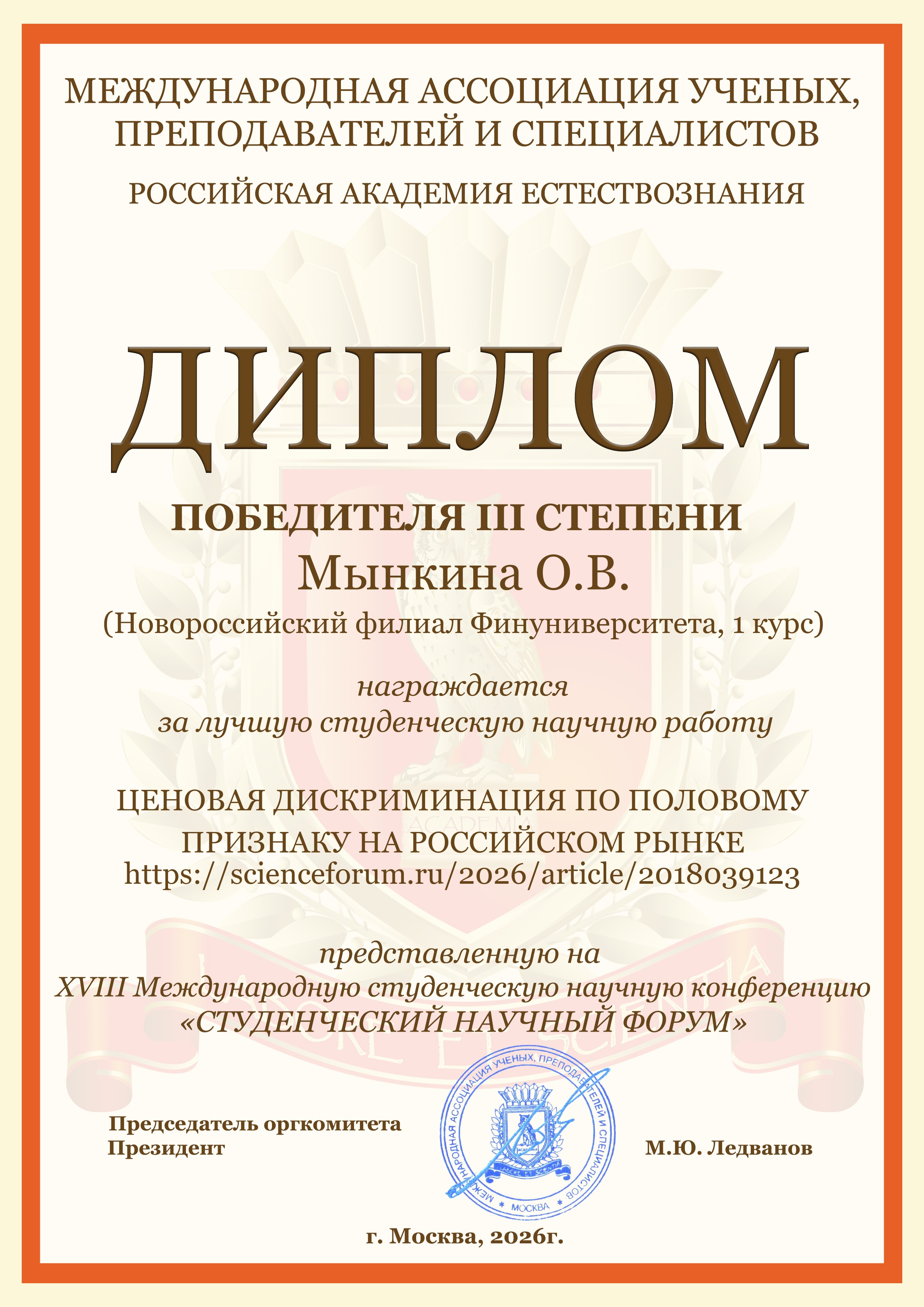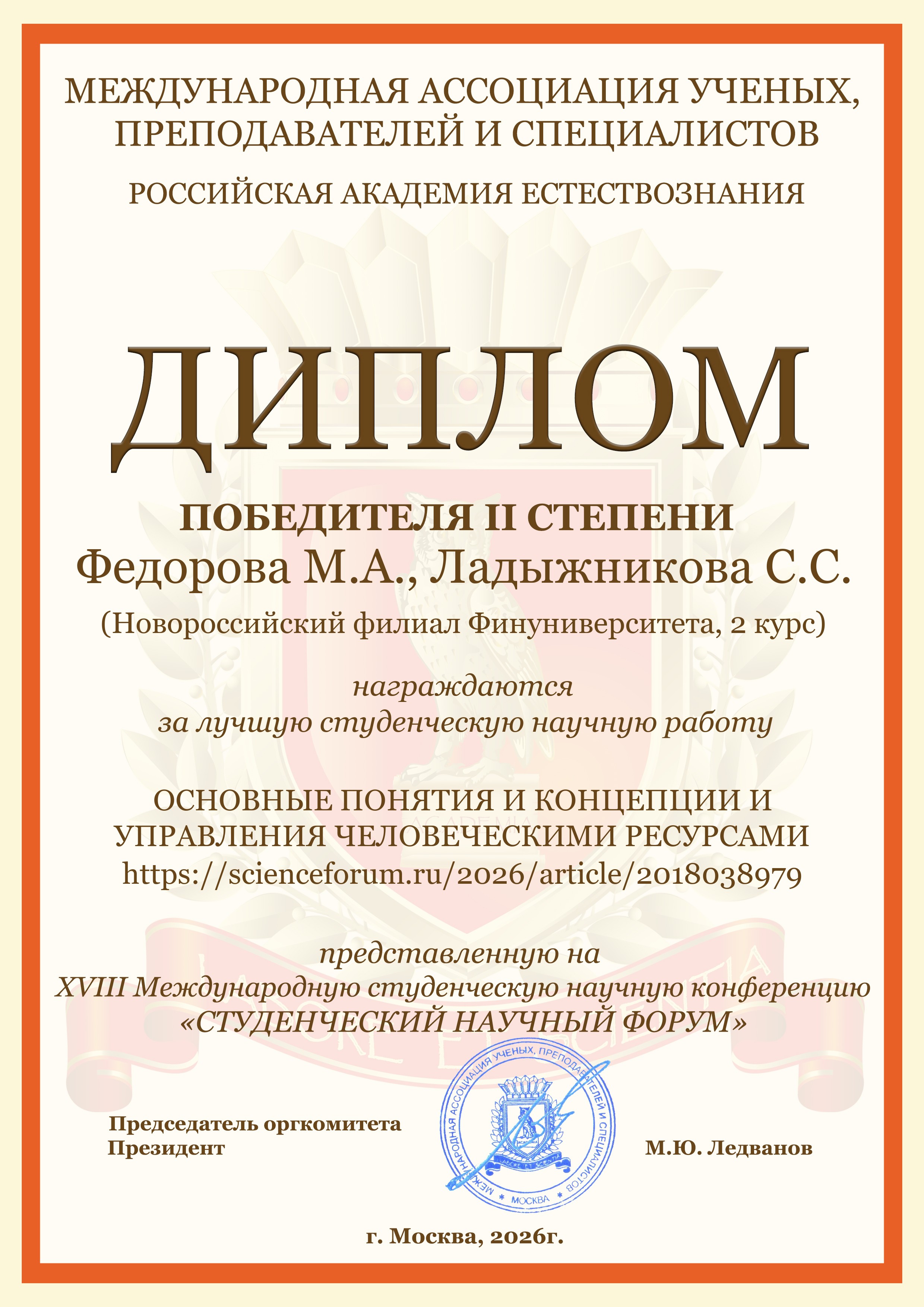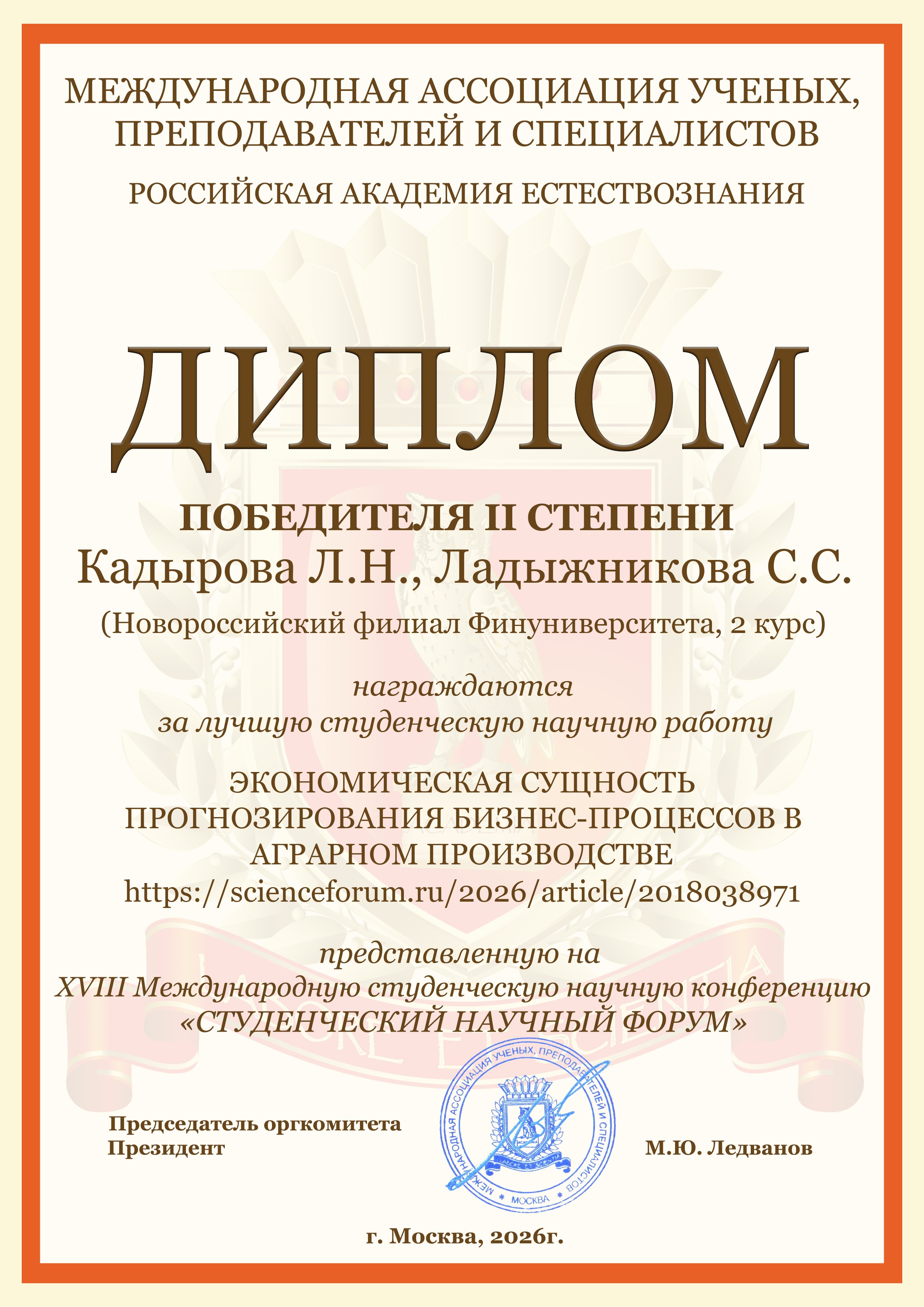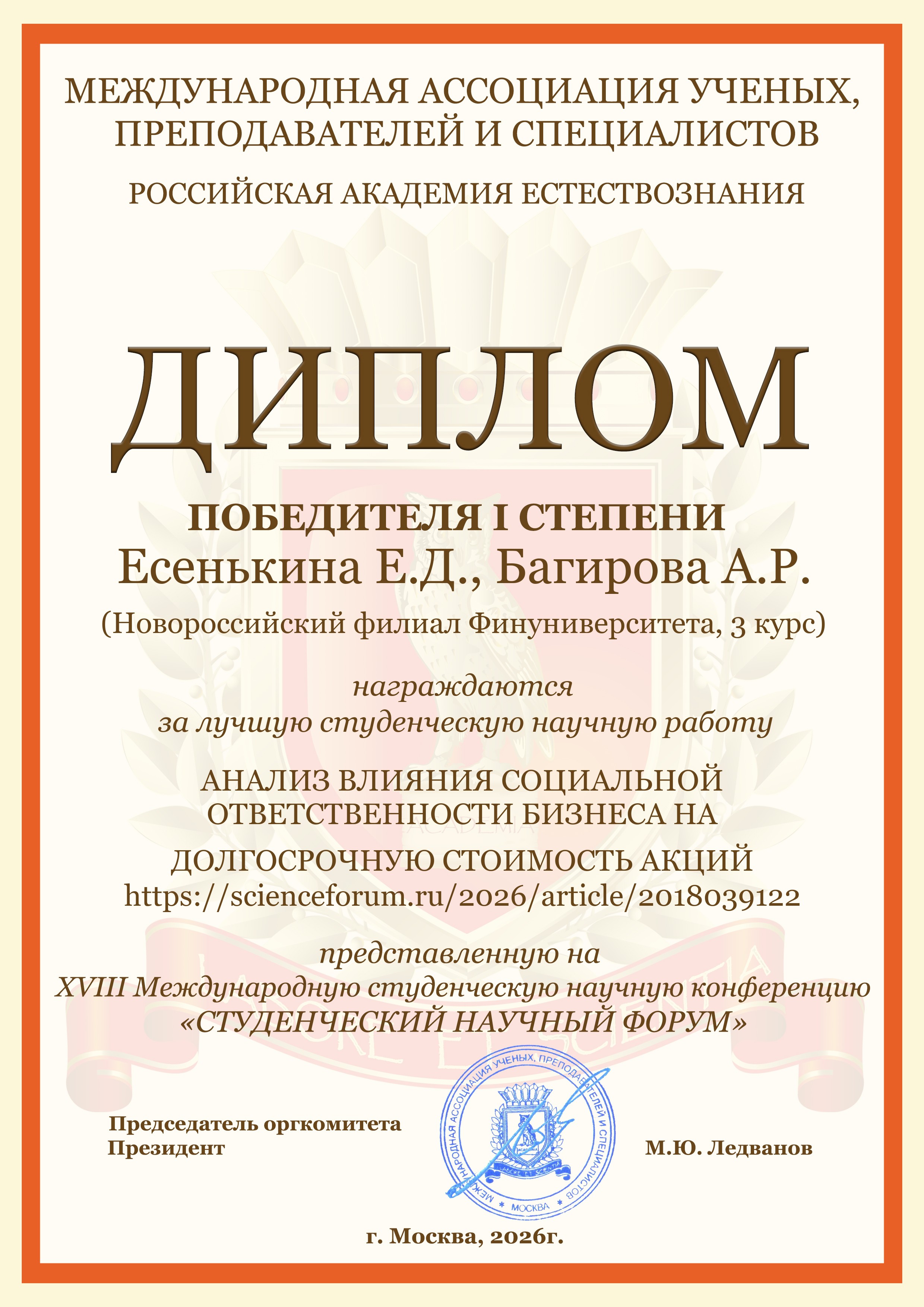 Студенты бакалавриата и магистратуры Новороссийского филиала Финуниверситета очной и очно-заочной форм обучения направлений подготовки "Экономика" и "Менеджент" приняли активное участие в Международной студенческой научной конференции «Студенческий научный форум 2026», организатором которой является Российская Академия Естествознания (г. Москва).