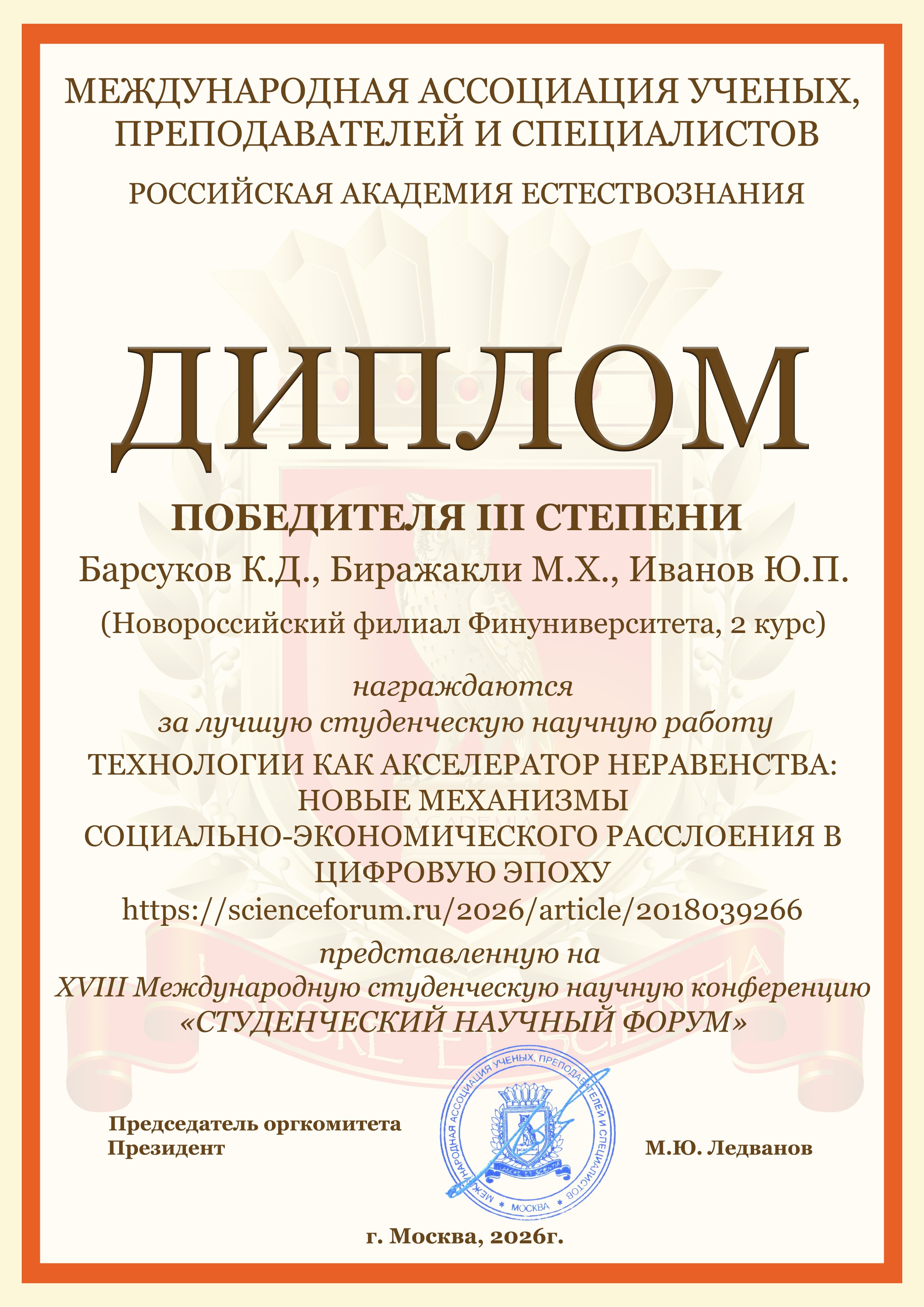 - Барсуков К.Д., Биражакли М.Х., Иванов Ю.П. ТЕХНОЛОГИИ КАК АКСЕЛЕРАТОР НЕРАВЕНСТВА: НОВЫЕ МЕХАНИЗМЫ СОЦИАЛЬНО-ЭКОНОМИЧЕСКОГО РАССЛОЕНИЯ В ЦИФРОВУЮ ЭПОХУ https://scienceforum.ru/2026/article/2018039266