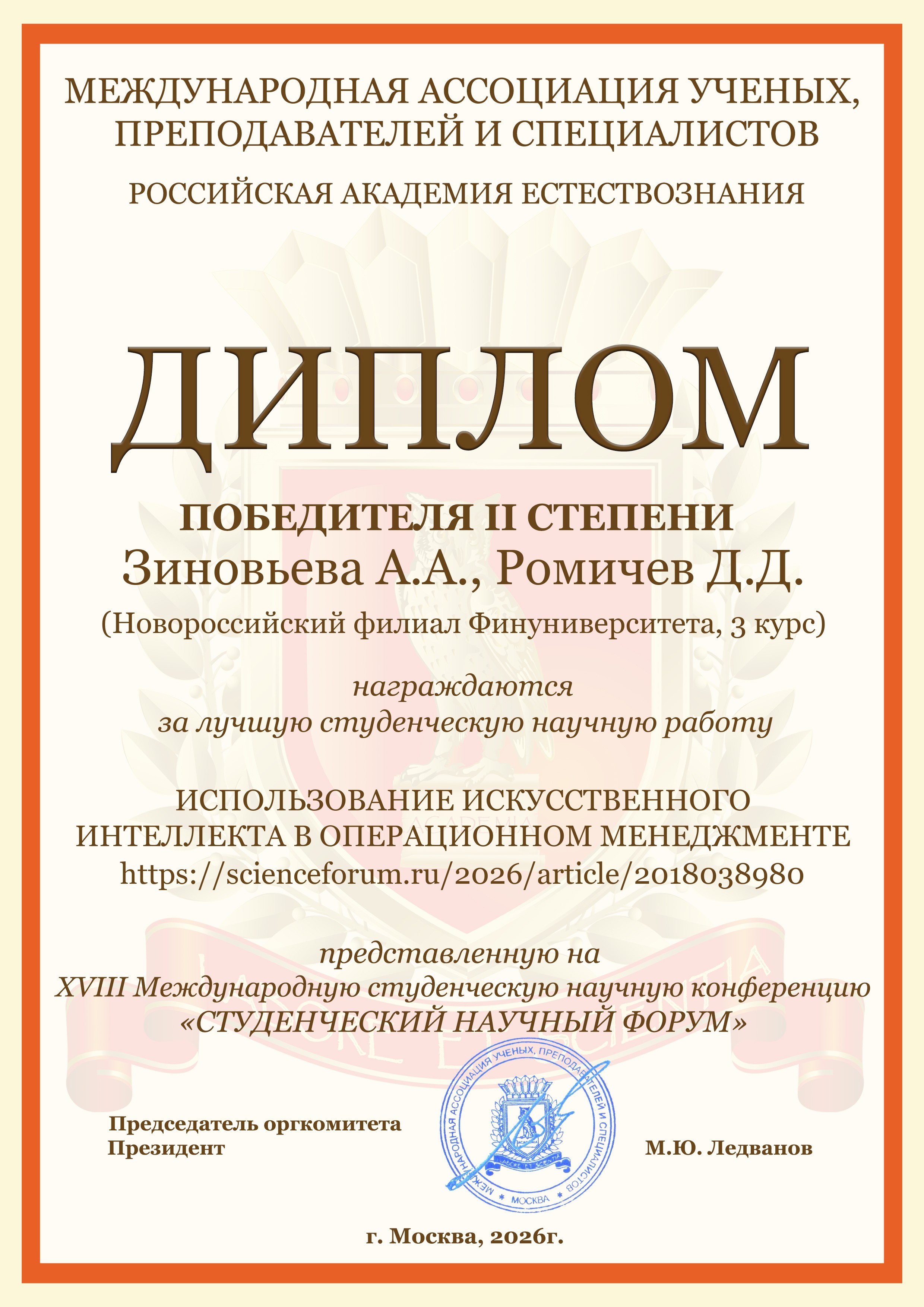 - Зиновьева А.А., Ромичев Д.Д. Использование искусственного интеллекта в операционном менеджменте https://scienceforum.ru/2026/article/2018038980